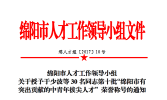 于少波董事長榮獲第十批“綿陽市有突出貢獻(xiàn)的中青年拔尖人才”榮譽(yù)稱號(hào)